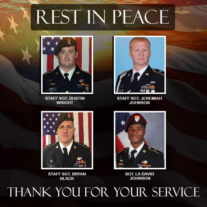 Lo que el episodio de Johnson ha oscurecido, siendo rico como material de las redes sociales, son las muertes de otros tres que perecieron con Johnson el 4 de octubre en Níger: el sargento del Estado Mayor. Dustin M. Wright , sargento del personal Bryan C. Black y el sargento del personal Jeremiah W. Johnson .